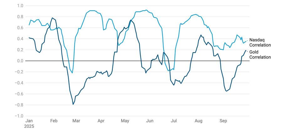 מאז 2017 נע הביטקוין יותר קרוב לנאסד"ק, הממוקד בטכנולוגיה, עם מתאם חודשי ממוצע של 0.32, בעוד הקשר שלו לזהב הוא 0.09 בלבד. המתאם מודד איך שני נכסים נעים יחד. ככל שהערך קרוב יותר ל-1.0, הקשר הדוק יותר. בעברית פשוטה, ביטקוין נע לפי קצב עמק הסיליקון. לא של פורט נוקס. הוא זינק עם מניות צמיחה וקורס כשתיאבון הסיכון נחלש, בעוד הזהב פורח, כשהעולם מתנדנד.