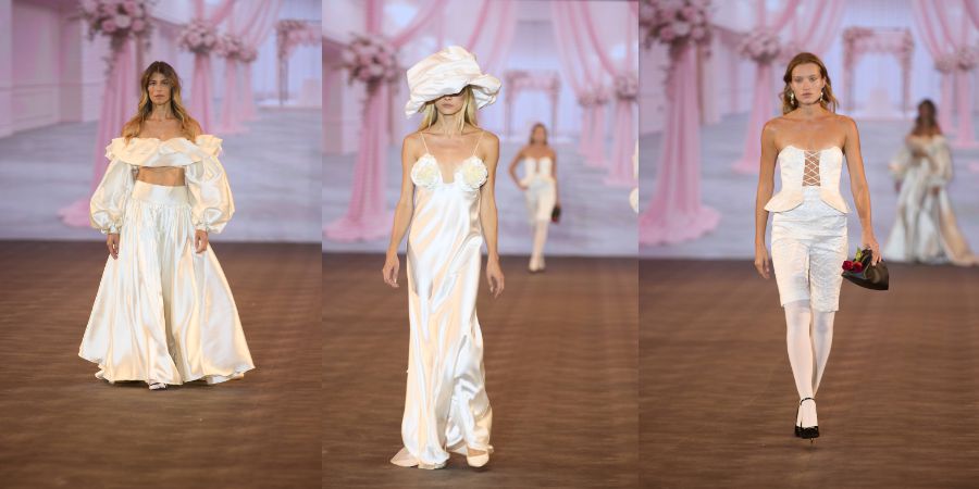 השמלות משלבות בין עדינות לרושם: גוונים רכים של ורוד, חמאה ותכלת מתכתבים עם בדים קלילים שנופלים בנעימות, לצד בדים בעלי נפח שמוסיפים דרמה. המחוכים והקצפות מוסיפים מראה חגיגי, אך העיצוב נשאר מודרני ורענן. “רציתי להחזיר את הדרמה והזוהר של פעם, אבל בצורה חיה ונושמת, לא נוסטלגית מדי”, הוא מסביר.